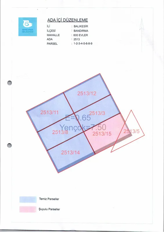 Belediye Encümeninin 12.11.2025 tarih ve 1237 sayılı Encümen kararı ile, 600 Evler Mahallesi, 2513 ada, 1-2-3-4-5-6-8-9 nolu parsellere ait ada içi düzenlemesinin, 1/1000 ölçekli Bandırma Uygulama İmar Planı notlarının 137. Maddesi ve 3194 sayılı İmar Kanununun 19. maddesi gereği onaylanmasına,